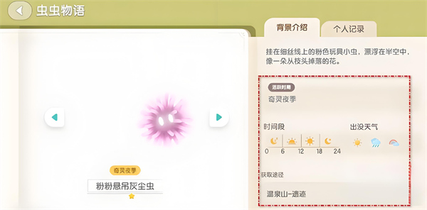 2、第二張圖為“蟲(chóng)蟲(chóng)物語(yǔ)”圖鑒,展示“粉粉懸吊灰塵蟲(chóng)”,含出沒(méi)季節(jié)(宿靈夜季)、時(shí)間、天氣及獲取途徑(溫泉山-通道),是收集養(yǎng)成玩法的圖鑒系統(tǒng)。