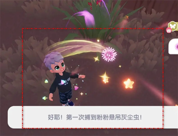 3、第三張圖是捕蟲(chóng)成功反饋,角色首次捕獲粉粉懸吊灰塵蟲(chóng)的互動(dòng),體現(xiàn)收集玩法的成就感與探索體驗(yàn)。