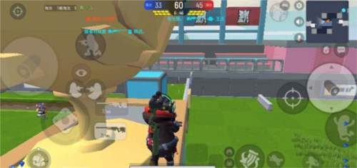 1、開局跳傘選擇“學(xué)?!保ńㄖ芗瘏^(qū)域),落地拾取“霰彈槍”(近戰(zhàn)強力武器),遭遇敵人利用樹后卡位左右。