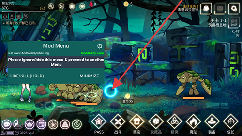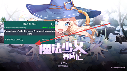 1、游戲加載時出現(xiàn)【Mod Menu】彈窗,若不想使用修改菜單,可點(diǎn)擊【HIDE/KILL(HOLD)】關(guān)閉,避免其影響正常游戲流程。