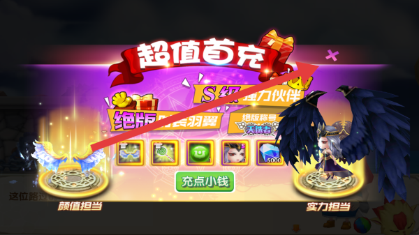 2、彈出“超值首充”界面,關(guān)閉(點×)或選擇【充點小錢】,獲取S級伙伴、絕版羽翼等獎勵。