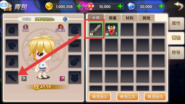 3、背包頁,點擊箭頭指向的武器(鎖狀標(biāo)識),為角色(猛牛萌萌噠)裝備,提升戰(zhàn)力(4538)。