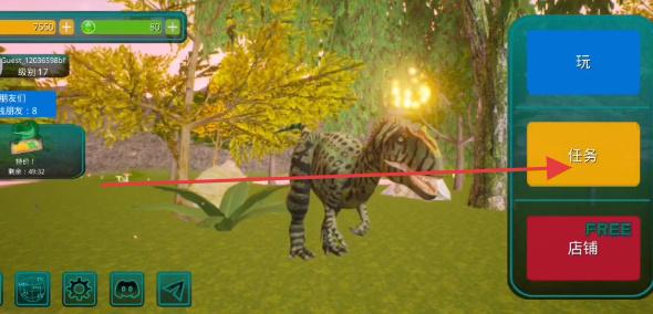 2、點(diǎn)“玩”進(jìn)地圖,先做新手任務(wù)!跟著指引找資源、升級,解鎖技能,遇到其他恐龍,同類組隊,異類別硬剛,前期血量少,容易死。