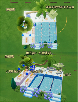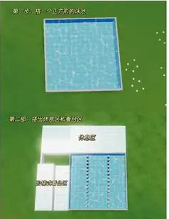 1、第一步挖泳池!選方正地塊,用“景觀池”道具圍邊,別留縫,材料不夠就去“埃里克斯家具店”買,攢摩爾豆,優(yōu)先完成基礎(chǔ)建造。