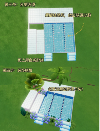 2、分割泳道用“細(xì)柱”!對(duì)齊泳池邊緣,隔出多l(xiāng)anes,搭配同色階梯,從商店選“藍(lán)白瓷磚階梯”,放泳池入口,進(jìn)出方便,顏值拉滿。