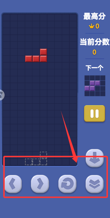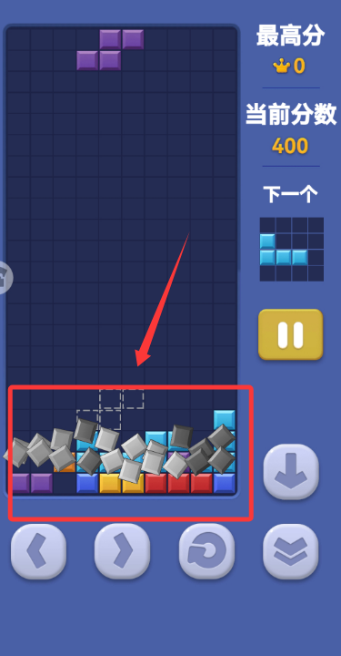 3、讓下落方塊與底部已堆積方塊契合,填滿一行或多行時(shí)可消除得分,持續(xù)累積分?jǐn)?shù)。