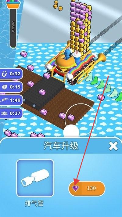 2、做“汽車(chē)部件升”!攢夠130鉆石,點(diǎn)“排氣管”升級(jí),2步確認(rèn),完成后移速+20%,超賺,解鎖新改裝(輪胎/外觀(guān))。