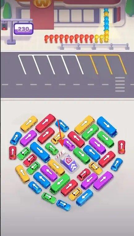 2、點(diǎn)擊汽車,按箭頭方向移動,逐步騰出空間,讓目標(biāo)車輛(如紅色箭頭指向車)順利通行。