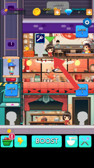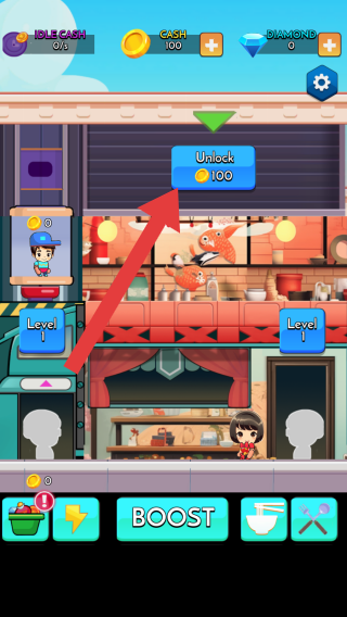 1、呈現(xiàn)的是經(jīng)營店鋪的場景,有解鎖(Unlock)功能(花費100金幣解鎖)、等級(Level)顯示、各類資源(ISLECASH、CASH、DIAMOND)及功能按鈕(BOOST等)。