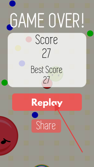 3、若游戲結(jié)束(GAME OVER!),點(diǎn)擊【Replay】按鈕,重新開始游戲,爭(zhēng)取突破之前27分的最佳成績(jī)。