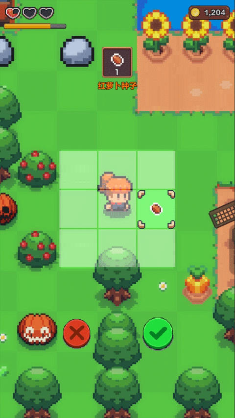 3、朝斧頭道具方向走,你就可以開始砍樹了,這項(xiàng)農(nóng)具不僅可以砍樹,還可以挖礦石和胡蘿卜。