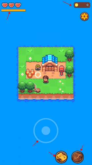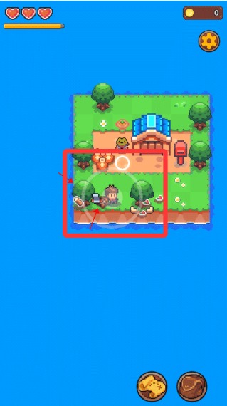 2、下方的圓圈圖標(biāo)是用來控制角色的移動(dòng)方向,右下方的地圖圖標(biāo)是用金幣來擴(kuò)大自己的島嶼面積的,書包圖標(biāo)是用來裝東西,左上角的愛心和進(jìn)度條是表示角色的體力和能量。