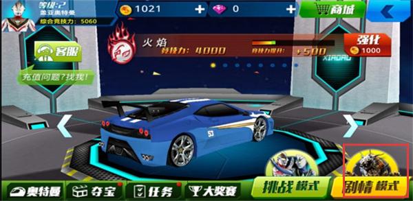 1、下載安裝完成后進(jìn)入游戲,點(diǎn)擊屏幕右下方的開始按鈕,選擇劇情模式或挑戰(zhàn)模式開啟賽車之旅。