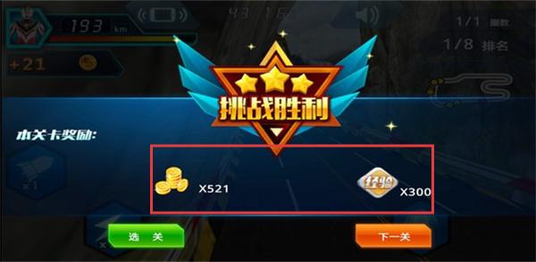 3、成功通關(guān)后獲得金幣經(jīng)驗(yàn)獎勵,可解鎖更高級的奧特曼鎧甲與賽車部件,挑戰(zhàn)更高難度的賽道與對手。
