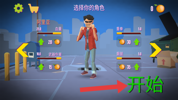 1、實(shí)體信息有角色“阿里亞”,以及血量、武器傷害、重拳、重腿等屬性數(shù)值,還有【開始】按鈕用于進(jìn)入游戲。