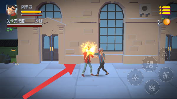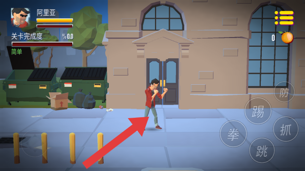 2、實(shí)體信息有角色“阿里亞”,顯示關(guān)卡完成度、難度(簡單),還有“防、踢、拳、抓、跳”操作按鈕。