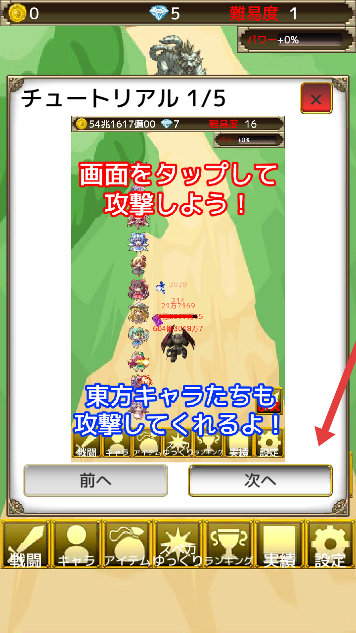 2、戰(zhàn)斗時按提示【畫面をタップして攻撃しよう】點擊屏幕攻擊,完成教程后點擊【次へ】推進(jìn)。