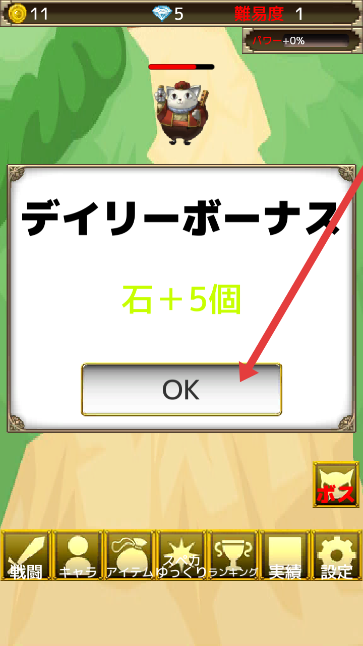 3、當(dāng)你獲得獎勵彈窗時,需要點擊【OK】確認(rèn)領(lǐng)取【石+5個】的獎勵,繼續(xù)東方幻想防衛(wèi)記的游戲進(jìn)程。