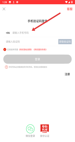 3、在進入到登錄頁面后,可以點擊上方輸入框填寫手機號碼,以便獲取驗證碼進行登錄。