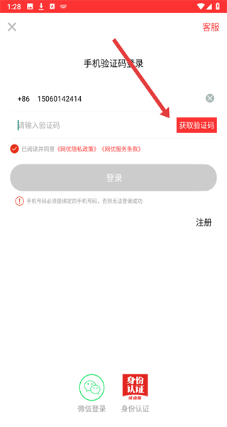4、在填寫好手機號,可點擊獲取驗證碼按鈕并填寫驗證碼后,即可點擊登錄按鈕完成登錄