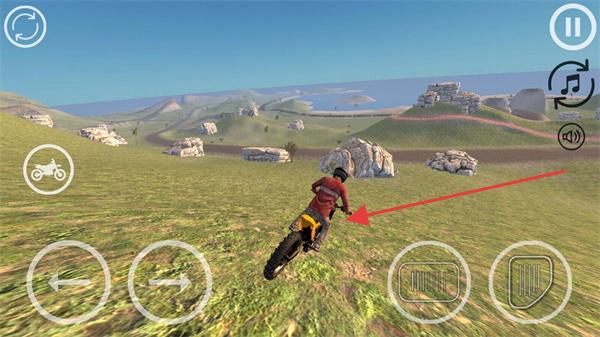 3、主菜單選模式,駕駛摩托出發(fā),在草地地形,按箭頭指引跨越丘陵前行。