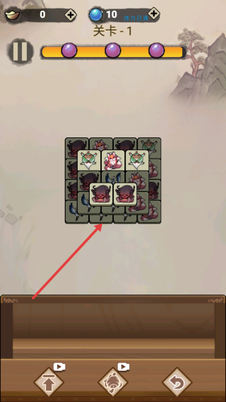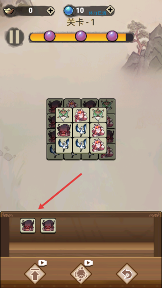 3、下方出現(xiàn)備用方塊時(shí),拖動(dòng)對(duì)應(yīng)怪物至棋盤空缺,補(bǔ)全可消除組合,持續(xù)推進(jìn),填滿進(jìn)度條(3個(gè)紫球),完成關(guān)卡1目標(biāo)。