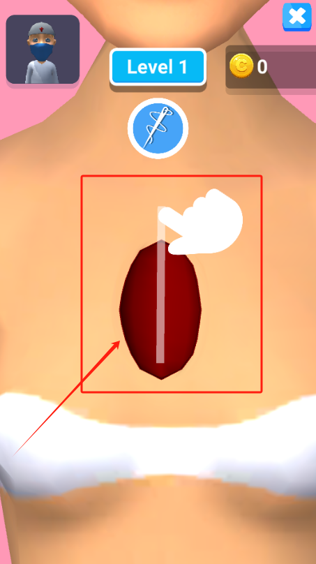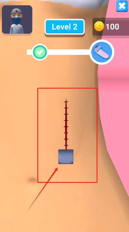 3、第二關(guān)要用縫紉機縫合傷口,看箭頭操作,賺了100金幣別亂花。