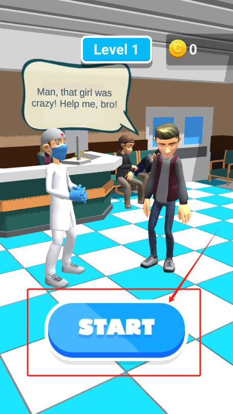 1、點藍(lán)色START按鈕開始第一關(guān),聽病人說有個瘋狂女孩,先了解情況。