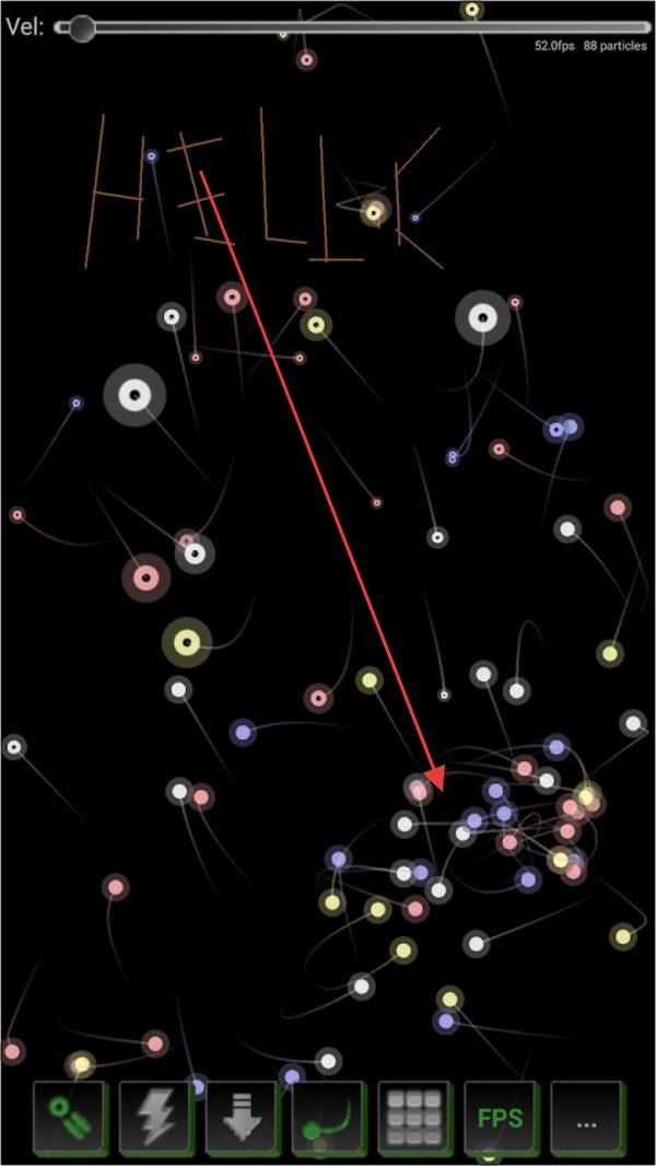 1、滑動(dòng)“Vel”調(diào)節(jié)速度,點(diǎn)擊下方功能按鈕,如綠色畫(huà)筆圖標(biāo),繪制粒子軌跡。