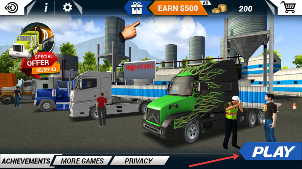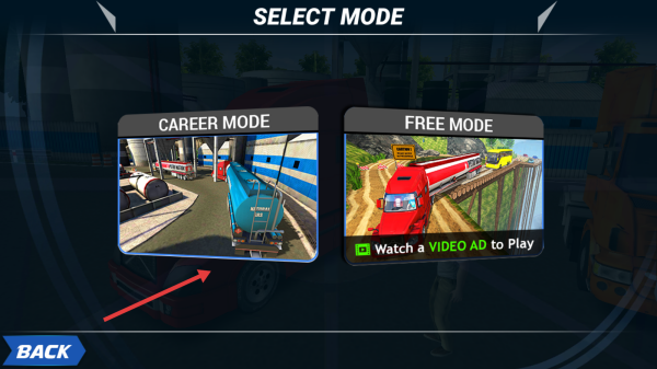 1、主界面點(diǎn)“PLAY”,忽略廣告、特惠,進(jìn)模式選擇,選“CAREER MODE”(生涯模式),駕駛藍(lán)色貨柜車(chē),開(kāi)啟運(yùn)輸任務(wù)。