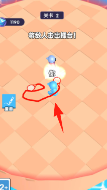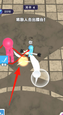 1、操控角色,緊盯箭頭指向的敵人,靈活滑動(dòng)屏幕,用拳頭、武器快速攻擊,把敵人擊出擂臺(tái)邊界。