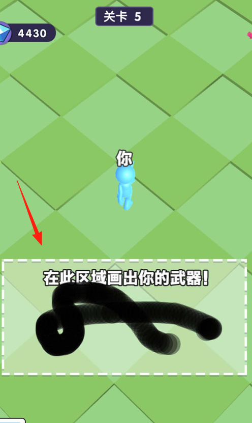 2、武器繪制(關(guān)卡5)在箭頭所指區(qū)域,自由畫出武器輪廓,像彎刀、長(zhǎng)棍等,畫完系統(tǒng)生成專屬武器,助力后續(xù)戰(zhàn)斗。