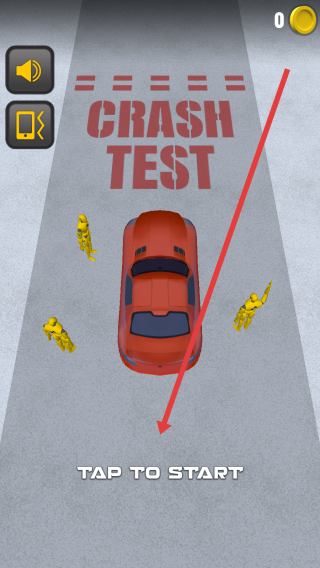 1、主界面點擊“TAP-TO-START”(箭頭指向),啟動紅色汽車,進(jìn)入碰撞測試賽道,開啟游戲。