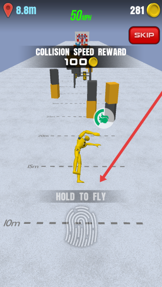2、行駛中按“Hold-to-Fly”提示(箭頭指向),長按屏幕讓假人飛起,躲避障礙,提升碰撞測試成績。