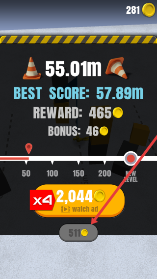 3、測試結(jié)束,在結(jié)算界面選511金幣獎勵(箭頭指向),積累財富,用于解鎖新車、升級假人,優(yōu)化測試表現(xiàn)。