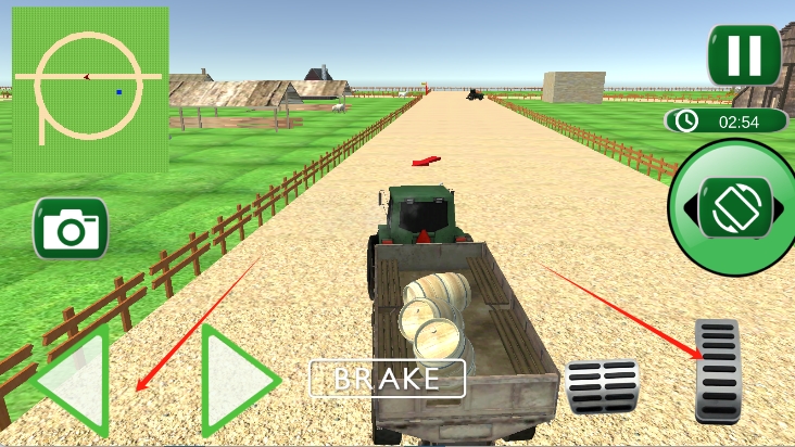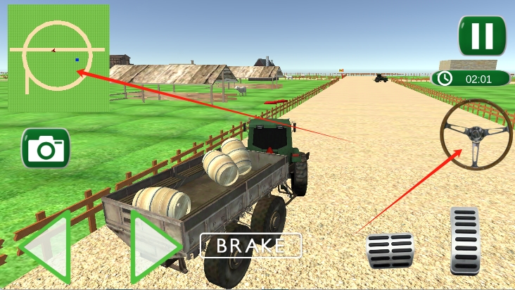 1、基礎拖拉機操作:通過虛擬搖桿或按鈕控制拖拉機的前進、剎車、轉向與倒車,保持拖拉機在道路上平穩(wěn)行駛。