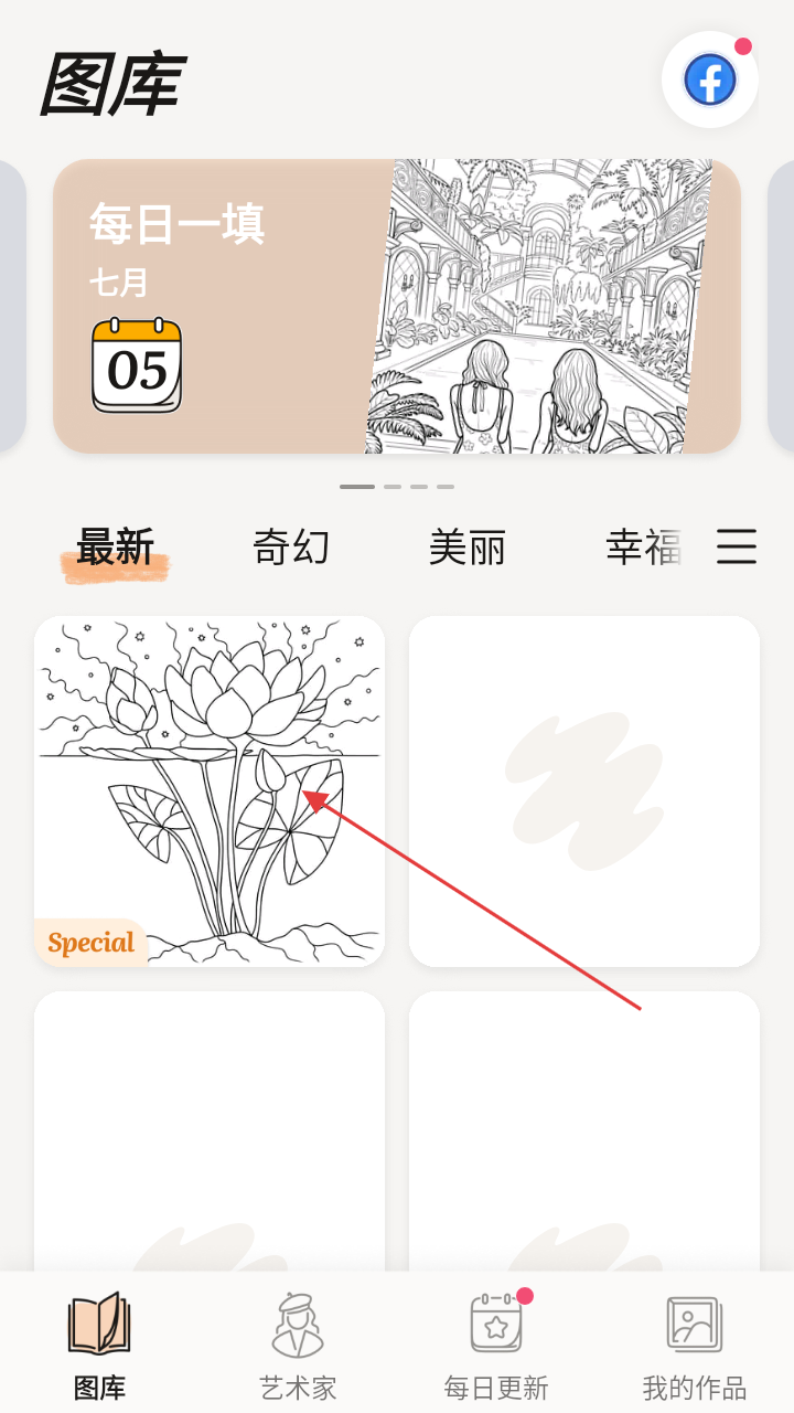 1、進(jìn)入圖庫(kù)界面,瀏覽“每日一填”及“最新”“奇幻”等分類,挑選心儀圖案(像荷花、建筑場(chǎng)景這類),點(diǎn)擊進(jìn)入填色操作界面 。