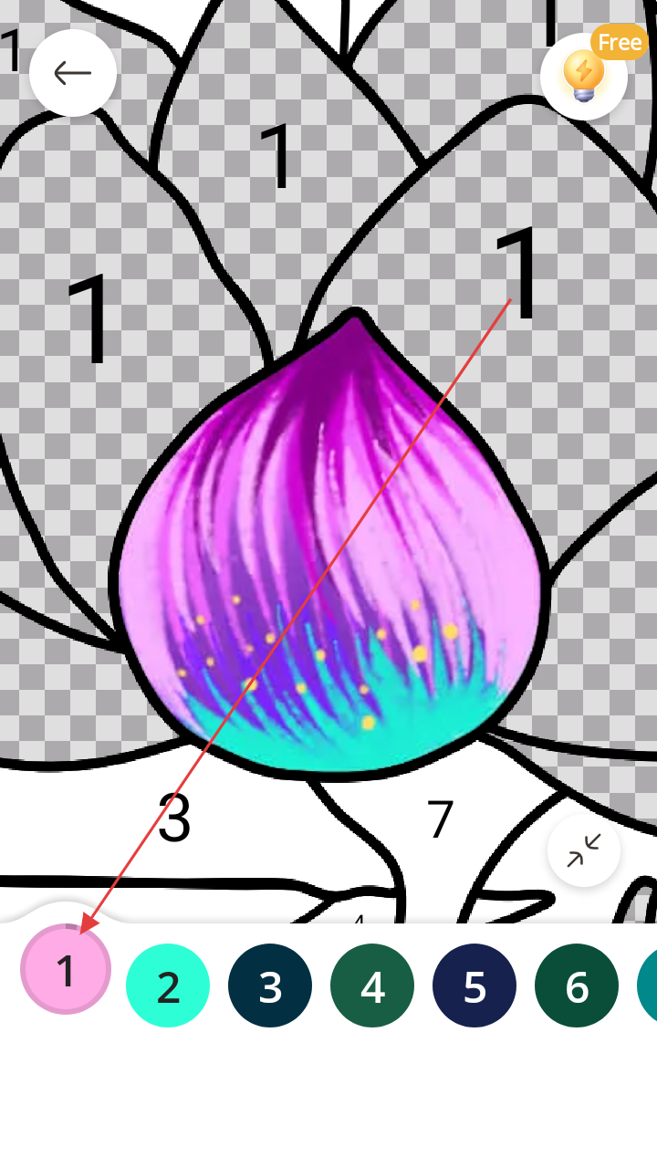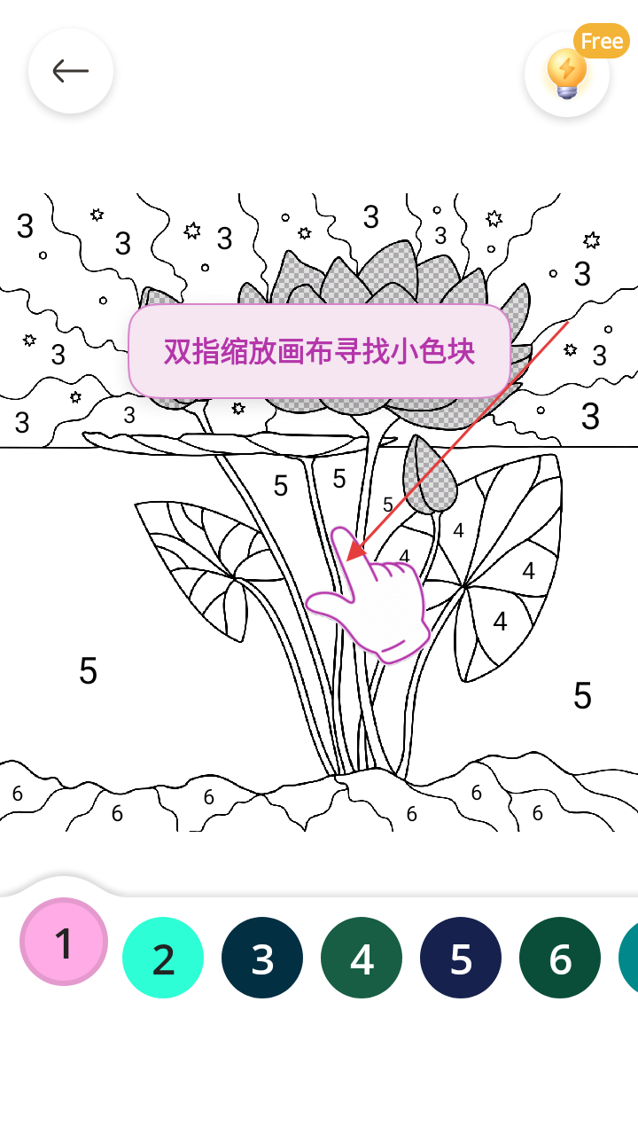2、依據(jù)界面提示,用雙指縮放畫(huà)布,仔細(xì)查找?guī)в袛?shù)字標(biāo)識(shí)的小色塊,從底部色環(huán)選中對(duì)應(yīng)數(shù)字的顏色,點(diǎn)擊色塊進(jìn)行填充上色 。
