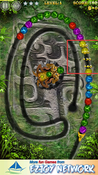 2、瞄準(zhǔn)軌道上的彩色珠子發(fā)射彈珠,匹配三個(gè)同色即可消除,注意珠子滑行速度變化。