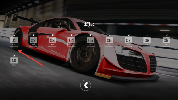 2、進(jìn)入“LEVELS”界面,確認(rèn)“01”關(guān)卡解鎖,點擊進(jìn)入,駕駛賽車在虛擬賽道準(zhǔn)備出發(fā)。