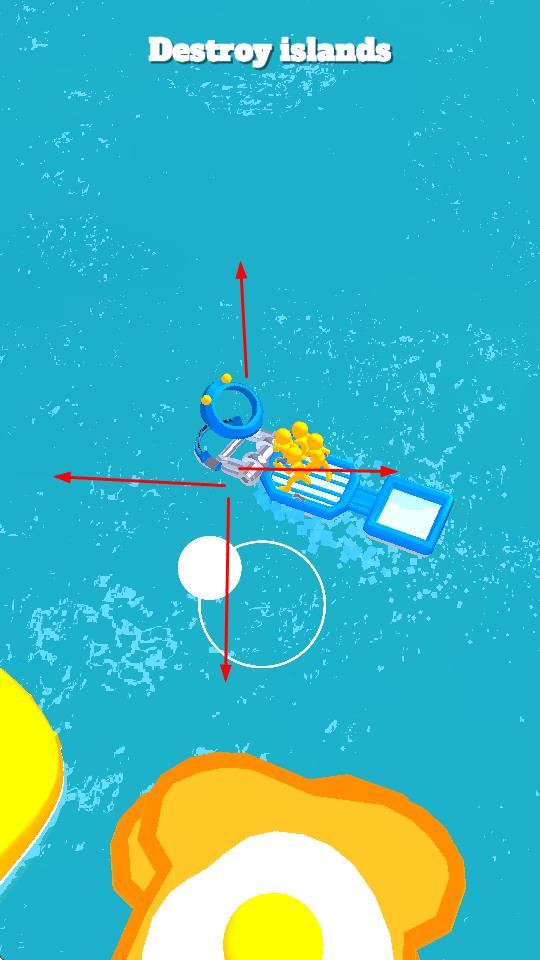 1、“操控船艦”,移動藍(lán)色船艦,調(diào)整方向(紅箭頭指),瞄準(zhǔn)并撞擊島嶼。