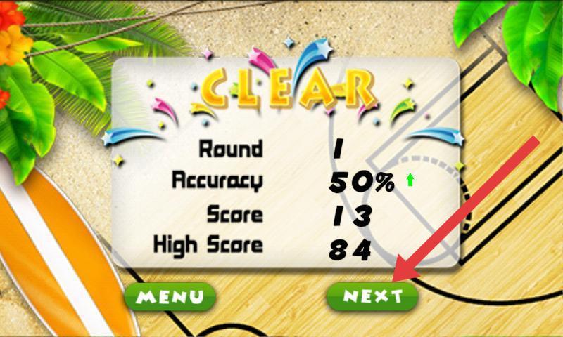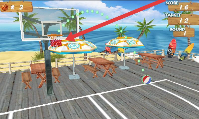 3、在海灘場景中,依據(jù)綠色拋物線軌跡瞄準籃筐,控制投籃角度與力度,嘗試命中籃筐以積累分數(shù)。