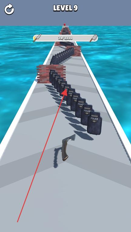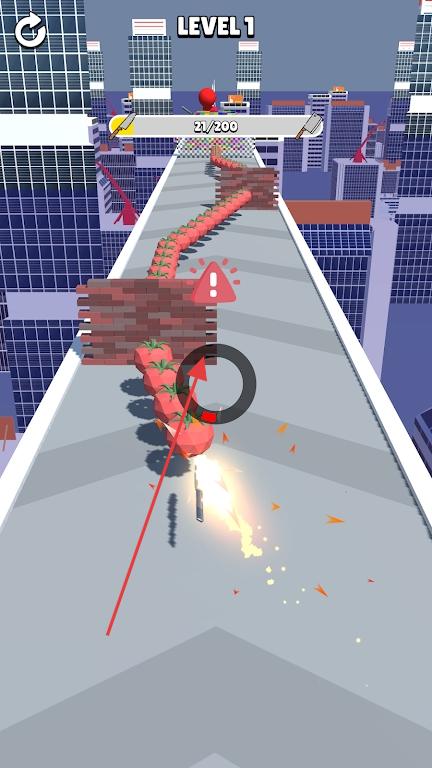 2、進階關卡中,面對更多樣的限定障礙(如帶次數標識的木板、旋轉盾牌)和敵人,邊跑酷邊精準點擊射擊,破壞障礙解鎖道具(如刀具數量加成、攻擊提速),提升闖關能力。