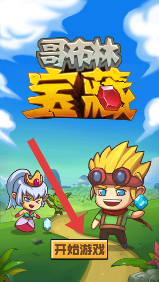 1、畫面有【開始游戲】按鈕,展示了兩個卡通角色,背景是綠色草地和藍天白云,屬于冒險尋寶類。
