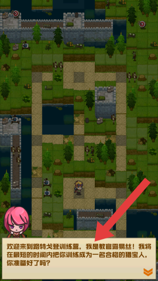 2、顯示“路特戈登訓(xùn)練營”場景,人物“教官露易絲”引導(dǎo)玩家,屬于像素風(fēng)冒險養(yǎng)成類,玩家將在訓(xùn)練營接受訓(xùn)練成為獵人。
