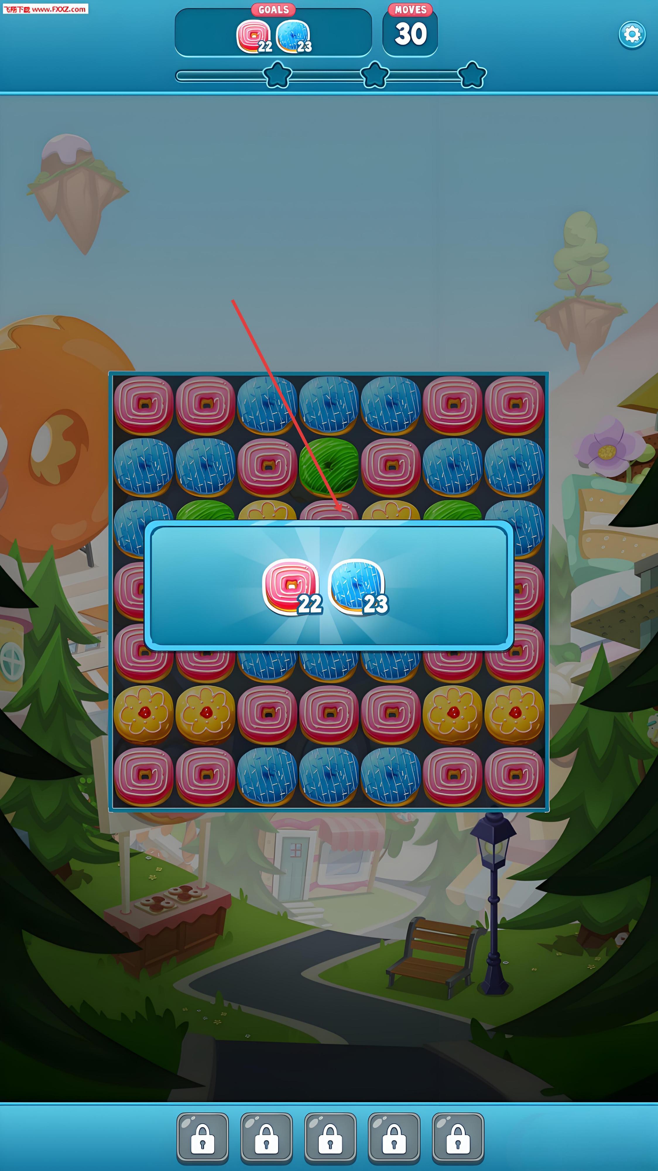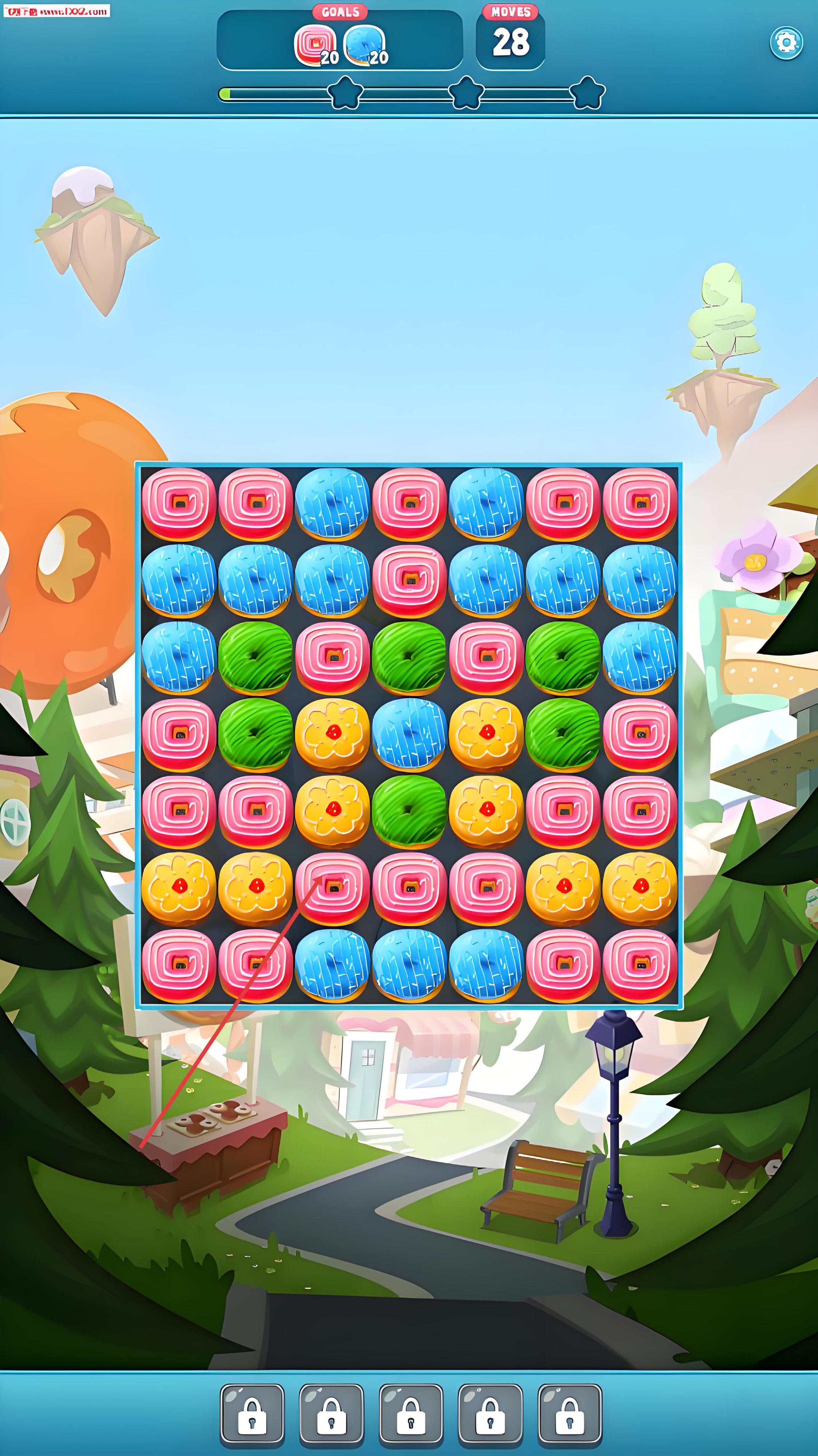 1、進入游戲后選擇關卡,在消除界面中觀察相同的甜甜圈及食物分布,通過滑動屏幕將三個或以上相同元素連成一線,完成消除并獲得分數(shù)與資源。