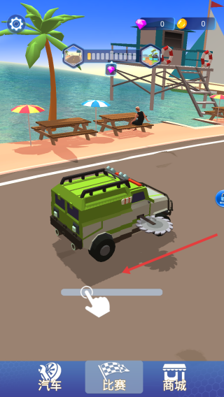 1、在主界面選綠色戰(zhàn)車,點擊“比賽”,進入公路競速,目標撞毀其他車輛(如藍色車),積累變身能量。