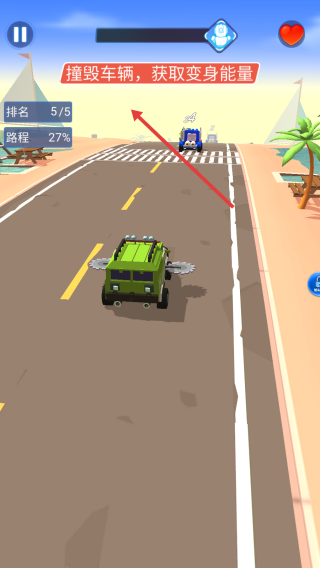 2、駕駛中,借左右移動撞敵車,提升排名(從5/5沖擊更高),留意“撞毀車輛,獲取變身能量”提示,觸發(fā)變身。