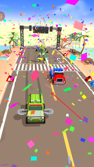 3、變身機器人后,強化競速、撞擊能力,沖過終點,贏比賽得金幣,去“商城”升級戰(zhàn)車,挑戰(zhàn)更難賽道。
