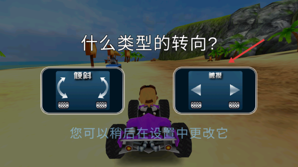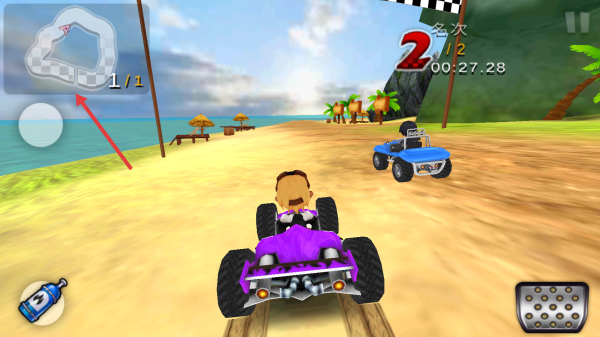 1、點(diǎn)擊“開始游戲”,選“觸摸”轉(zhuǎn)向(易上手),進(jìn)入沙灘賽道,操控紫色越野車競速,留意小地圖(左上角)規(guī)劃路線。